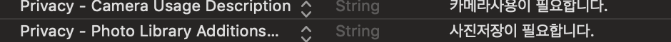 10. info.plist파일에 카메라사용을 위한 메시지와 PhotoLibary에 이미지를 추가하기 위한 메시지를 만들어 주어야 함.